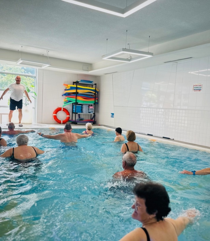 Ponadto dysponujemy salą do kinezoterapii wyposażoną w urządzenia treningowe do gimnastyki zbiorowej, indywidualnej i sprawnościowej , a także krytym, rehabilitacyjnym basenem solankowym z jacuzzi oraz saunami