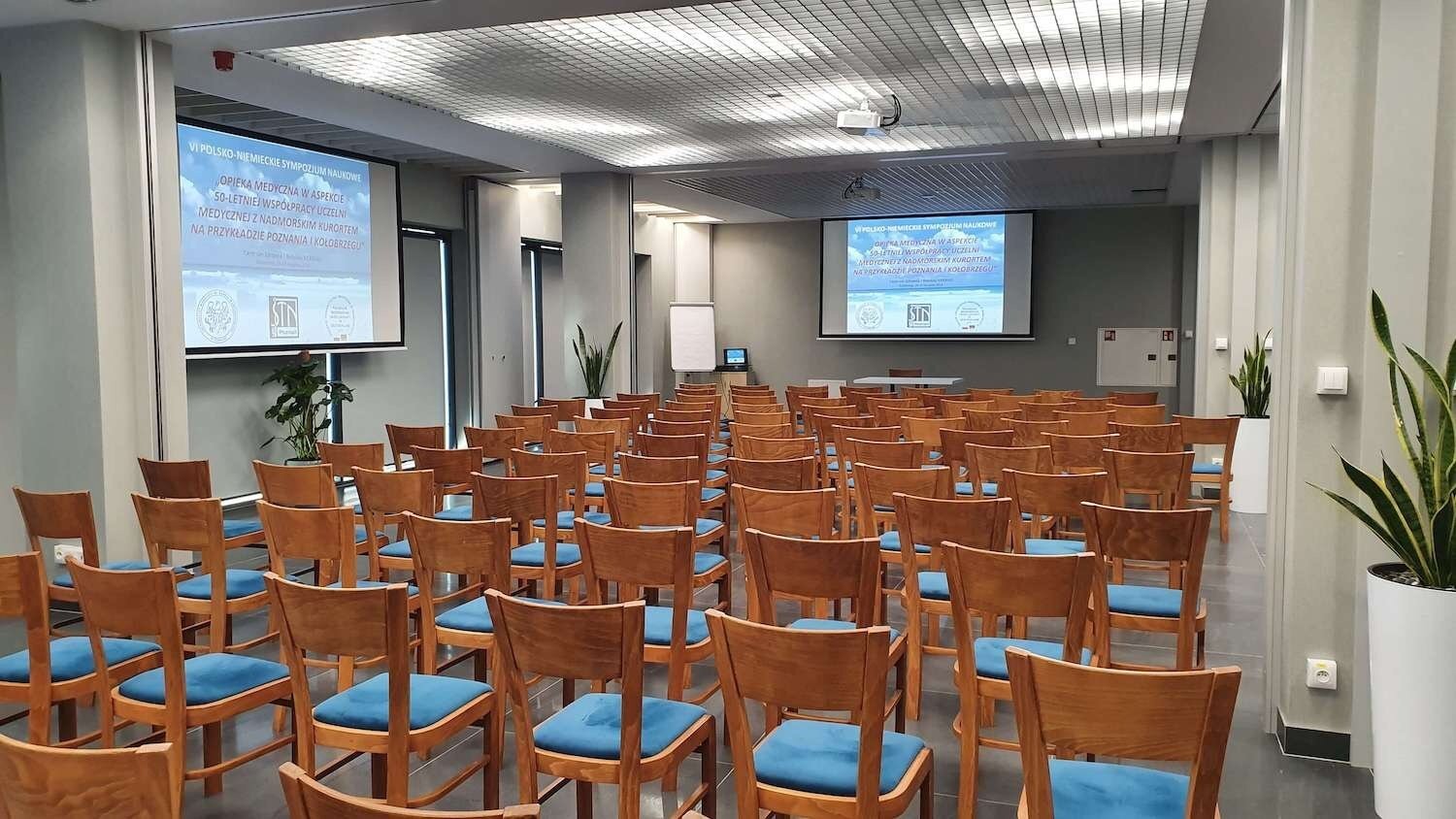System przesuwnych ścian pozwala na swobodne gospodarowanie przestrzenią. W szybki sposób możemy wydzielić dwie lub trzy mniejsze sale. Przeszklone ściany zapewniają idealne naturalne naświetlenie (z możliwością całkowitego zaciemnienia). Bogate zaplecze gastronomiczne umożliwia zorganizowanie serwisu kawowego oraz uroczystej kolacji czy bankietu.